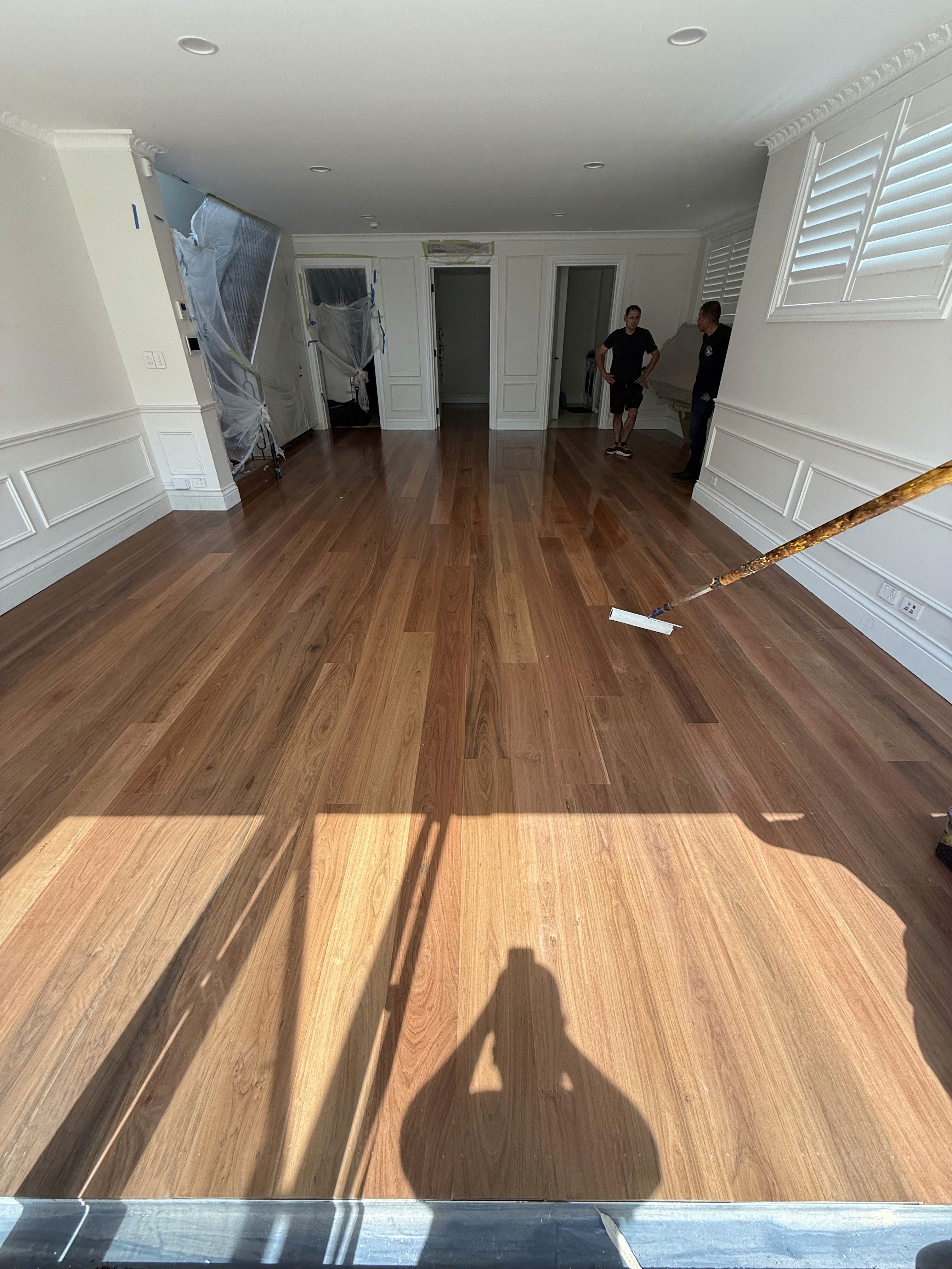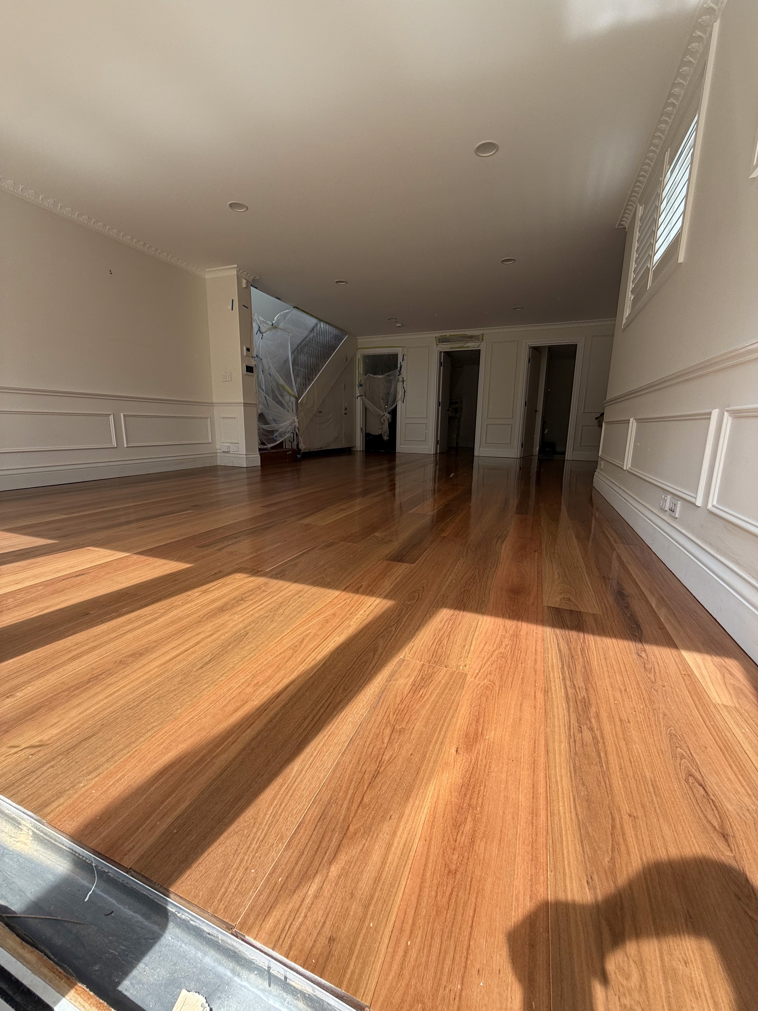 The floor was finished with premium Grey Ironbark, expertly laid using secret and top nailing techniques, then sanded and polished to a high standard. Delivered in line with the requirements of the ATFA (Australian Timber Flooring Association), the project stands as a technically demanding yet successfully executed rectification, restoring both performance and visual quality.