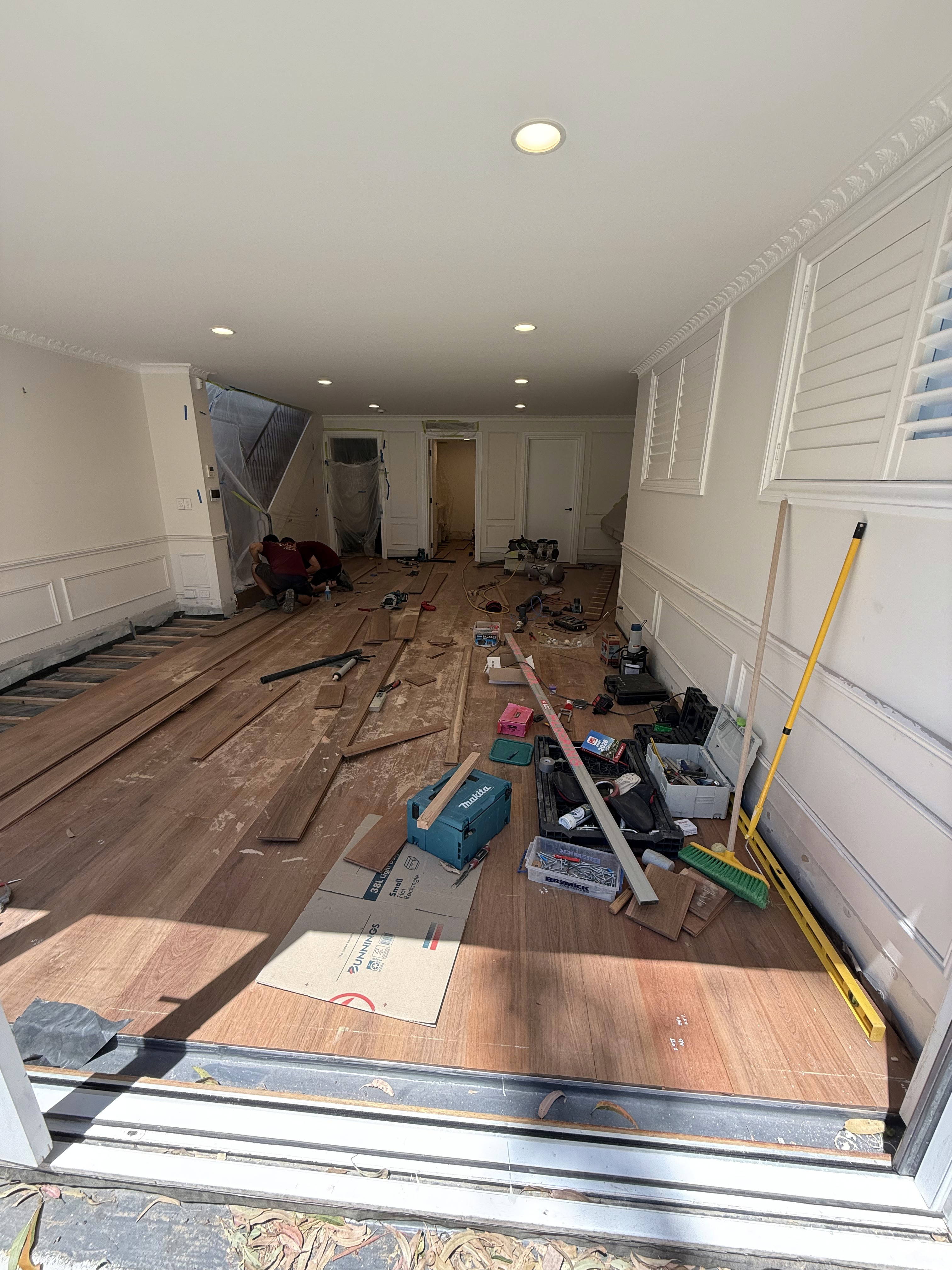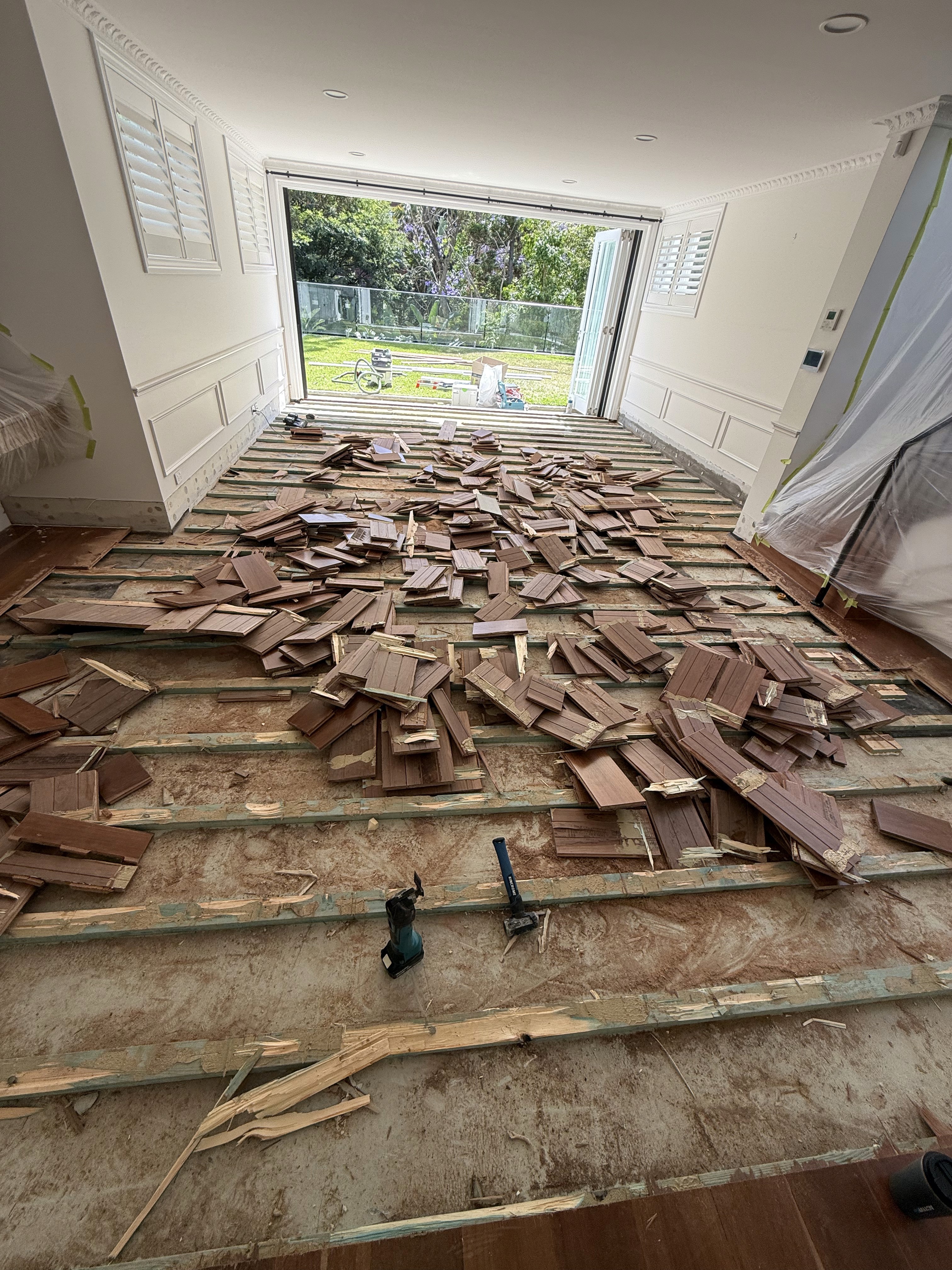 This Bellevue Hill project involved the complete rectification of a failed timber flooring system, where improper waterproofing had led to severe moisture damage and warping within just 18 months. With the property already subject to legal proceedings, the scope required a precise, compliant, and highly professional approach to fully rebuild the flooring from the ground up.