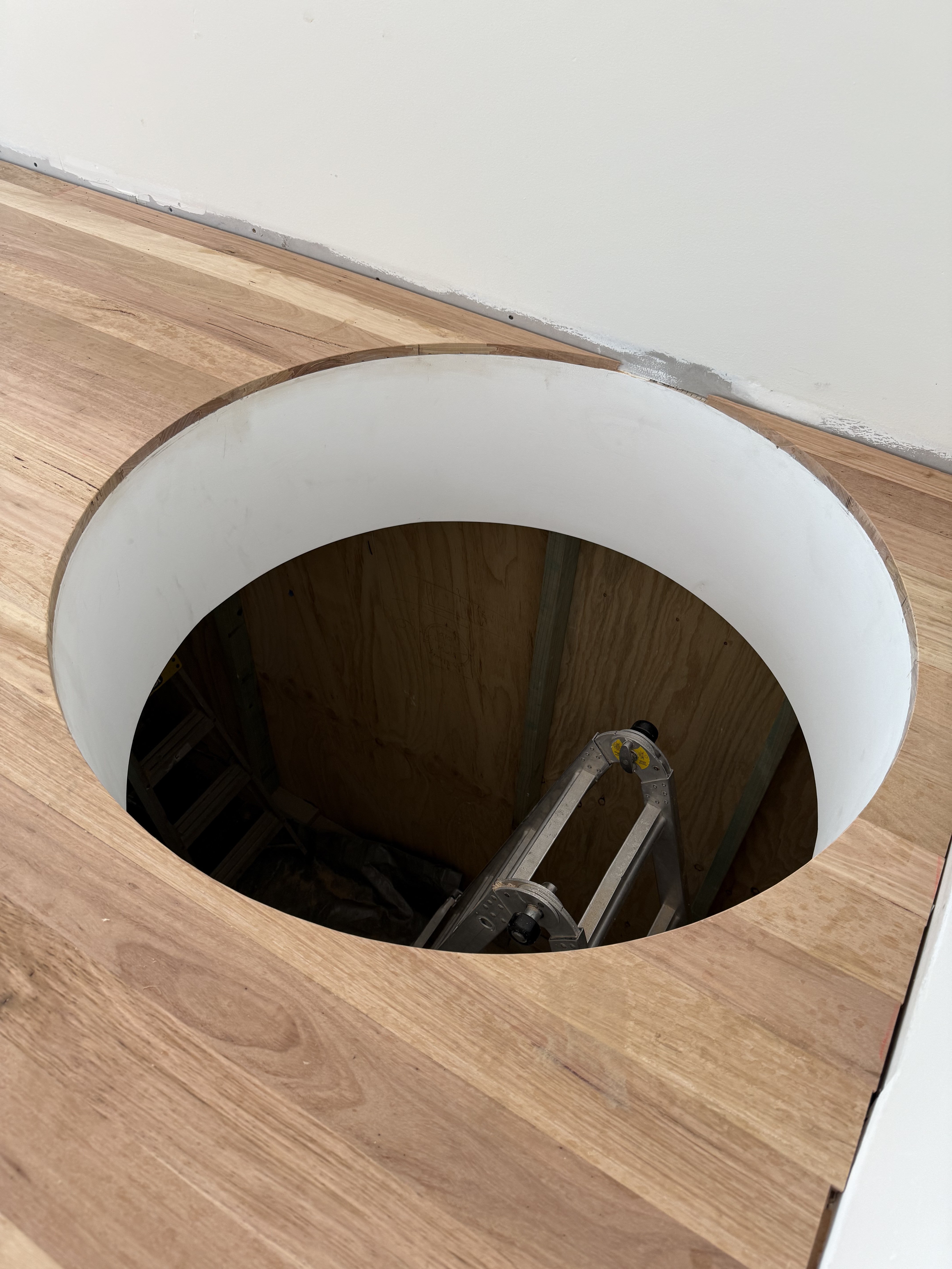 A key feature of the project is the custom staircase, seamlessly integrated with the flooring, along with a distinctive rounded cut-out that provides access to the lower level. This detail adds a unique architectural element, demonstrating the level of precision and craftsmanship applied to every aspect of the build.